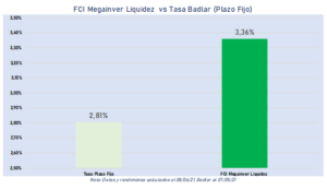 A efectos de comparar, en los últimos 30 días el desempeño del FCI Megainver Liquidez Pesos, uno de los mejores en su categoría, rindió mucho más que la tasa badlar (plazo fijo) en el mismo plazo, según podemos ver en el cuadro a continuación: