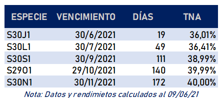 Las Ledes son para inversores conservadores y moderados con un horizonte de inversión que actualmente puede ser entre 19 y 172 días. Asimismo, estas letras presentan rendimientos superiores al (TNA) 34,25% de la tasa badlar (plazos fijos) según podemos ver en el siguiente cuadro: